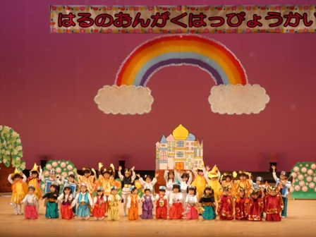 一年間の総まとめとしてプリニーの市民会館(各務原市民会館)でお遊戯、音楽劇、オペレッタ、歌・器楽合奏の発表を行いました。園児一人一人が主役となり、広いステージに立ち笑顔一杯で楽しく発表できました。ご家族の方に子ども達の成長した姿を観てもらう事ができ うれしく思いました。